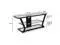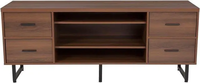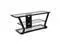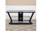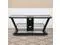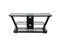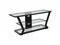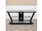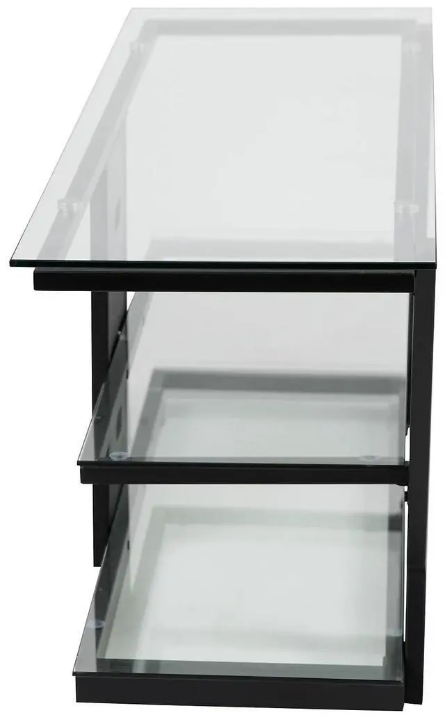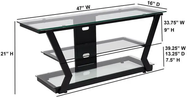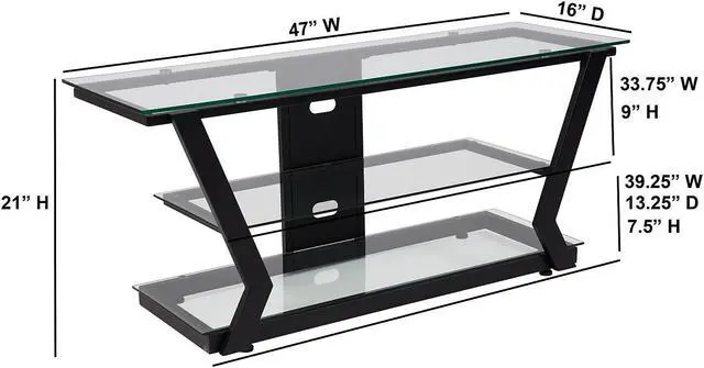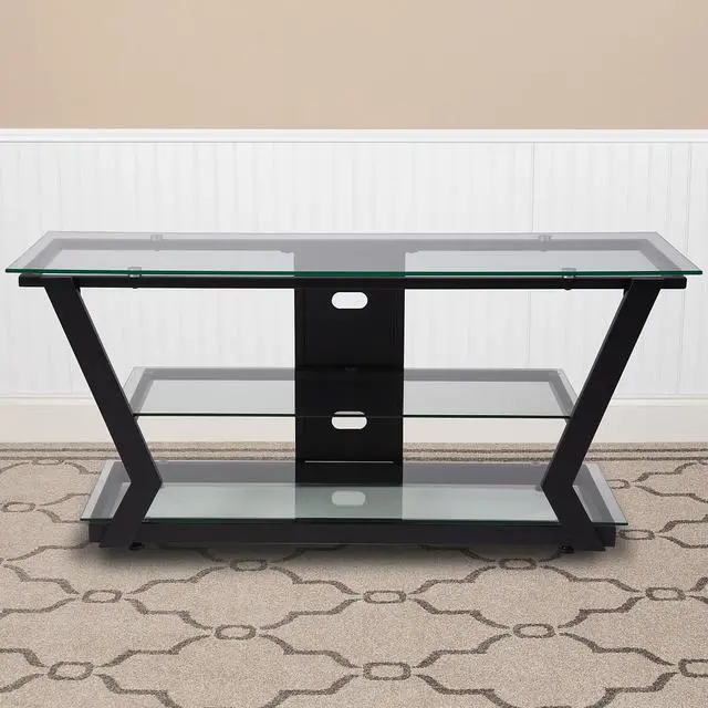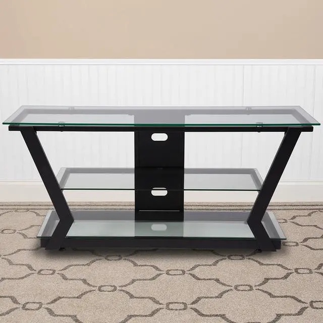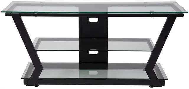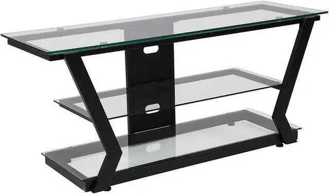 Dare to be different and add some panache to your decorative pallet. Featuring a designer bent metal frame with clear tempered glass shelving, this gorgeous TV stand is an excellent choice for any modern space. This cutting edge entertainment console boasts a wire management panel to keep all of your cords in place for a neat clean appearance. The chrome tubular legs finish off the look while adjustable floor glides help protect your flooring. Keep this piece looking great with a water-based cleaner.