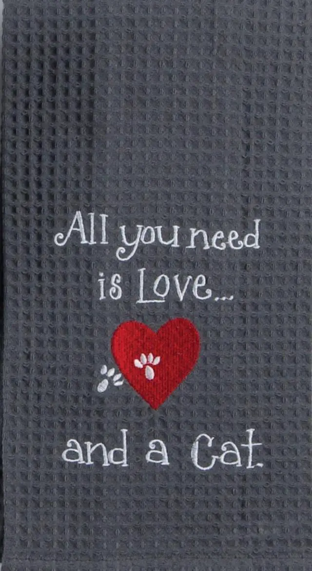 The two most important things in life for any cat lover! This humorous waffle towel features large meticulous embroidery a convenient loop for hanging and thick waffle weave. The waffle weave makes this towel absorbent and the embroidery makes it a personal statement for your kitchen or a meaningful gift! Kay Dee Designs has been selling textiles for a well-dressed kitchen since 1951.