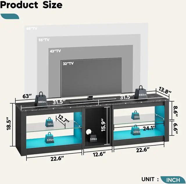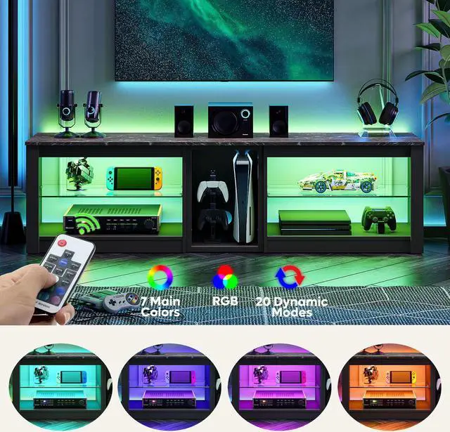 RGB LED Light: The cabinet has LED lights offering 7 primary colors and 20 modes, creating an immersive home theater effect.