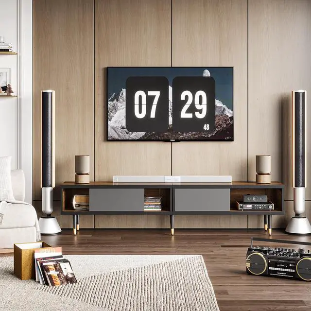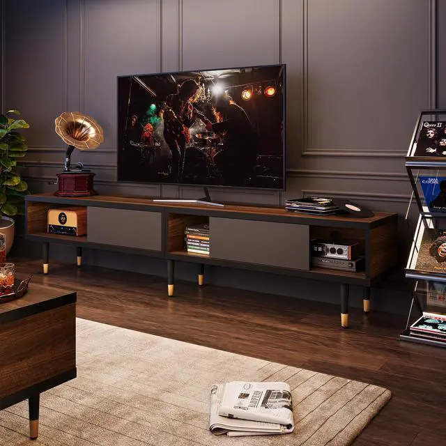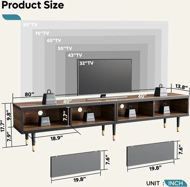 Entertainment Center Dimension80"L x 13.8"W x 17.7"H. The mid century modern TV stand is ideal for most flat-screen TVs up to 75 inches.