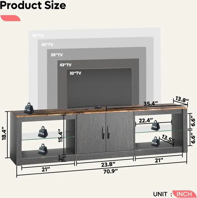 The back wire holes inside the cabinets also help you organize wires and cables. ?Modern Combined with Rustic Style? This media stand is designed with dimension of 70.8" L* 13.6" W* 18.3" H. The TV stand made of oak P2 class particle board and recommended for 43 55 75 inch Flat Screens. Exquisite wood grain texture and modern design adds rustic appeal and vibes to your living room. Enjoy happy family moment with such classic modern entertainment center. ?Sturdy and durable?Made of qualified and CARB certified particle board. The TV cabinet has great stability and durability, with a weight capacity of up to 100 lbs.