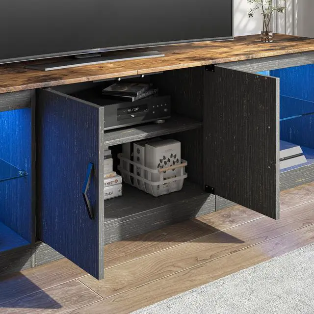 ?RGB Lighting & 22 Dynamic Modes?The Bestier TV console provides an excellent & immersive viewing or video game experience. The included remote control allows you to choose and customize your atmosphere according to your mood and scene in 7 main colors and 20 display modes, such as exciting games and scary movies. ?Spacious Storage and Tempered Glass Shelves?This television entertainment stand features 4 open shelving areas separated by tempered glass to hold your display items such as headphones, DVDs, gaming devices or photo frames. The closed storage cabinet can be used to store your personal items.