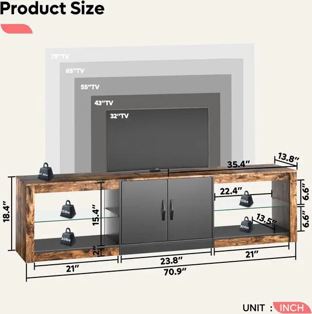 The back wire holes inside the cabinets also help you organize wires and cables. ?Modern Combined with Rustic Style? This media stand is designed with dimension of 70.8" L* 13.6" W* 18.3" H. The TV stand made of oak P2 class particle board and recommended for 43 55 75 inch Flat Screens. Exquisite wood grain texture and modern design adds rustic appeal and vibes to your living room. Enjoy happy family moment with such classic modern entertainment center. ?Sturdy and durable?Made of qualified and CARB certified particle board. The TV cabinet has great stability and durability, with a weight capacity of up to 100 lbs.