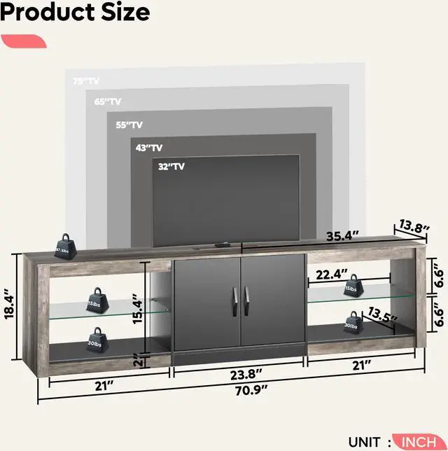 The back wire holes inside the cabinets also help you organize wires and cables. ?Modern Combined with Rustic Style? This media stand is designed with dimension of 70.8" L* 13.6" W* 18.3" H. The TV stand made of oak P2 class particle board and recommended for 43 55 75 inch Flat Screens. Exquisite wood grain texture and modern design adds rustic appeal and vibes to your living room. Enjoy happy family moment with such classic modern entertainment center. ?Sturdy and durable?Made of qualified and CARB certified particle board. The TV cabinet has great stability and durability, with a weight capacity of up to 100 lbs.