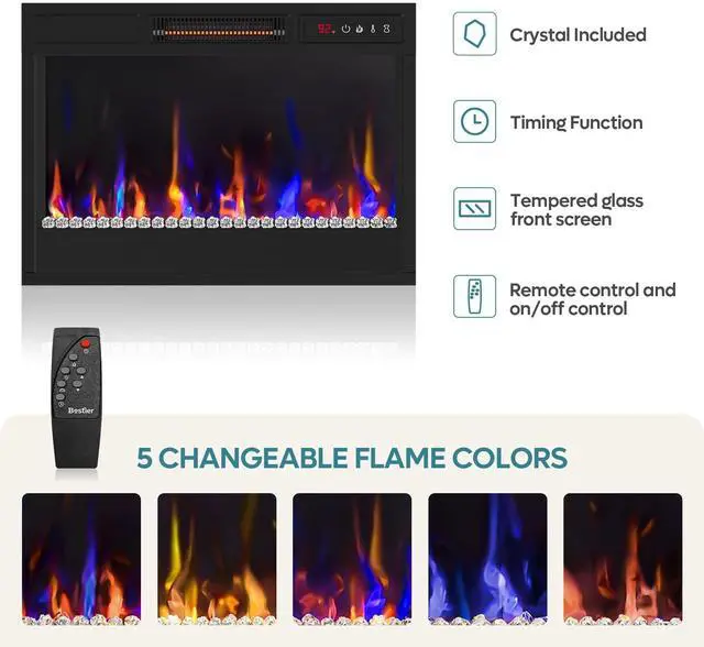 The 23-inch electric fireplace insert quickly heats spaces up to 400 square feet, with adjustable temperatures from 62°F to 92°F. Enjoy the ambiance of five realistic flame colors and five brightness levelseven without heat. Built-in overheat protection ensures peace of mind during use.