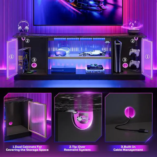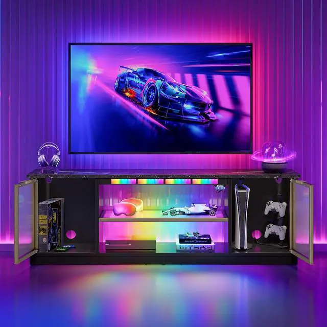 Upgrade your living room or gaming setup with this modern LED TV stand featuring a music sync light system. With 6 color options and 7 dynamic modes, the lights react to your music, movies, and game audio for immersive vibes. Made from durable P2-grade particle board, it supports TVs up to 65" and includes anti-tip hardware for safety. Translucent aluminum-framed doors with adjustable shelves keep your consoles organized and your space clutter-free. Easy to assemble with labeled parts and video guide. A sleek, smart choice for entertainment spaces.