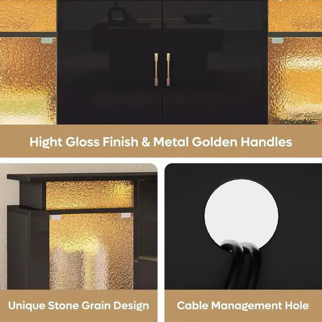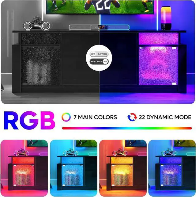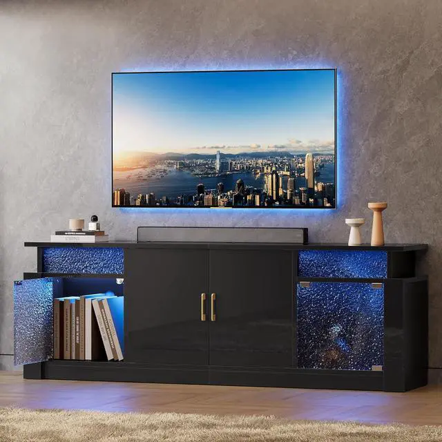 Bring modern elegance to your living room with the Bestier LED TV Stand. Designed with a glossy finish and translucent acrylic stone grain doors, this entertainment center delivers a refined look while enhancing your atmosphere with customizable RGB LED lightschoose from 7 colors and 22 dynamic modes to set the perfect mood.