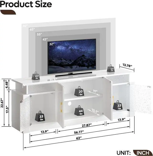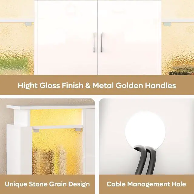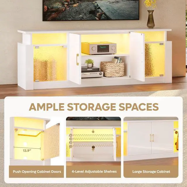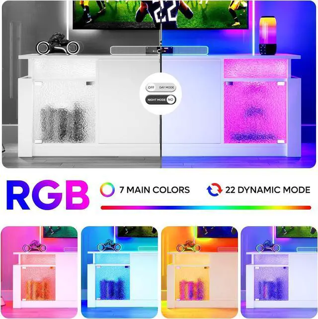 Bring modern elegance to your living room with the Bestier LED TV Stand. Designed with a glossy finish and translucent acrylic stone grain doors, this entertainment center delivers a refined look while enhancing your atmosphere with customizable RGB LED lightschoose from 7 colors and 22 dynamic modes to set the perfect mood.