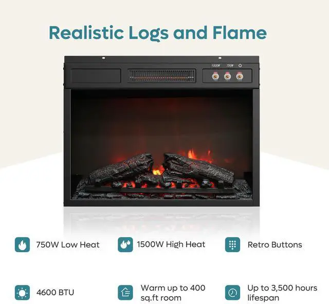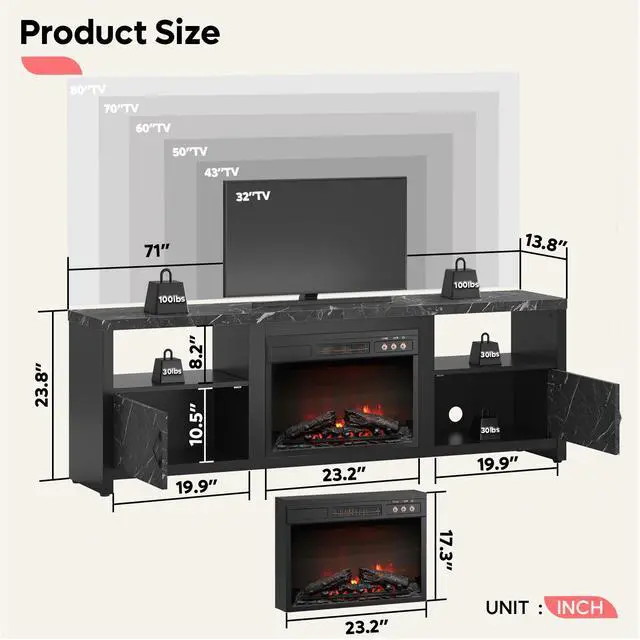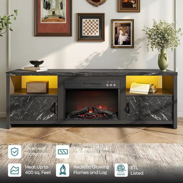 Upgrade your living room with this 70.8" fireplace TV stand, perfect for 32"-80" TVs. Features 2 cabinets and 2 open shelves for storage and built-in cable management. The 23" electric fireplace insert offers realistic log effects, 750W/1500W heat settings (4600 BTU), and remote-controlled LED lighting with 7 colors and 22 dynamic modes. Certified for safety (UL & CSA) and built with a durable metal frame and particleboard, this entertainment center supports up to 200 lbs. Easy assembly with clearly numbered parts included.