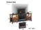 The TV stand features a classic wood grain finish with X stainless steel sides and vintage legs, blending farmhouse and French country design. Two open shelves provide space for speakers or media players, while two large closed cabinets keep games, blankets, and accessories neatly stored.