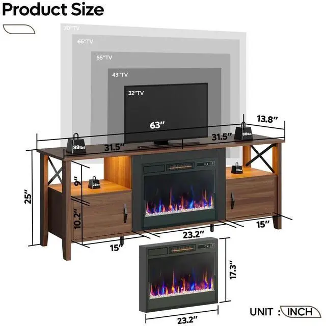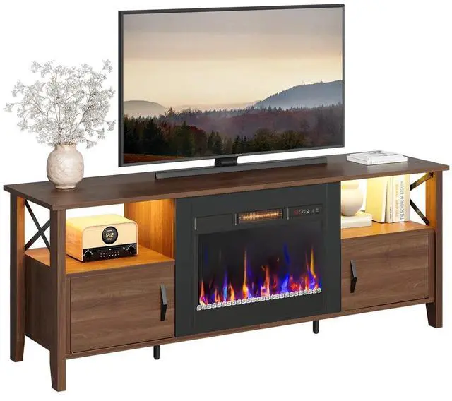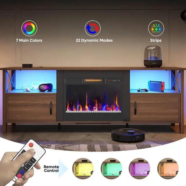 Add warmth and style to your living space with this farmhouse fireplace TV stand. The 23" electric fireplace insert offers 7 flame colors, 22 dynamic LED modes, 5 brightness levels, and 5 flame speedsall easily controlled by remote. Heating up to 400 sq. ft. (4600 BTU, 1500W), it includes a timer, child lock, and overheat protection for safety.