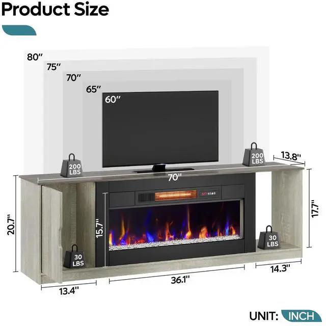 - With dimensions of 70" L x 14" W x 20" H, this TV stand offers a modern aesthetic that complements any decor. It supports 55", 66", 70", and 80" TVs, providing a perfect centerpiece for your entertainment area.