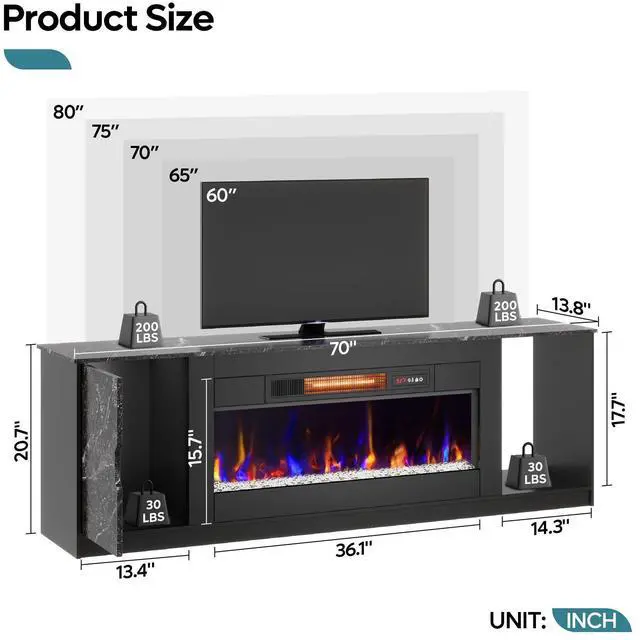 Bestier 70" Modern Fireplace TV Stand for TVs Up to 80" with LED Lights and Storage, PS5 Gaming TV Console for Living Room , Black Marble