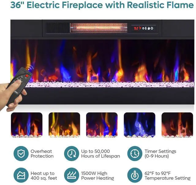 3. The 36" wide electric fireplace includes 5 dimmer levels, temperature control, and a timer setting, offering supplemental heating for areas up to 400 square feet. Enjoy the warmth and comfort with the ease of a remote control.