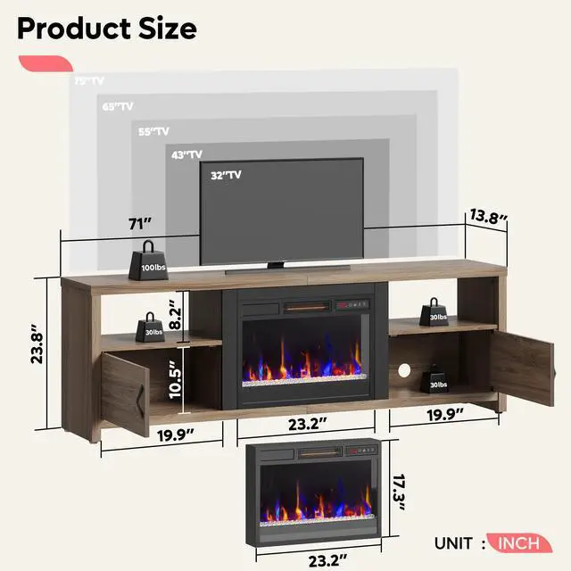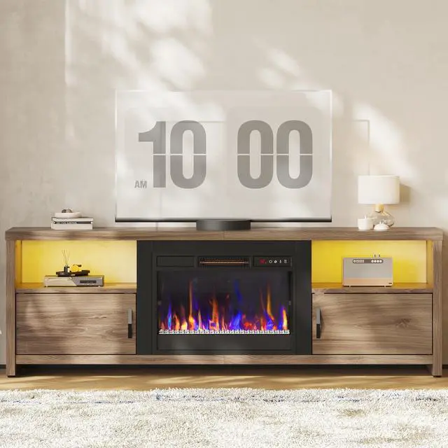 Create a cozy and modern entertainment hub with the Bestier 70" TV Stand featuring a built-in electric fireplace and dynamic LED lighting. Designed for both function and style, this console effortlessly combines home comfort with a contemporary look, ideal for living rooms, bedrooms, or game rooms.