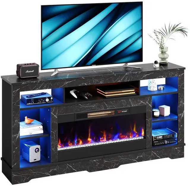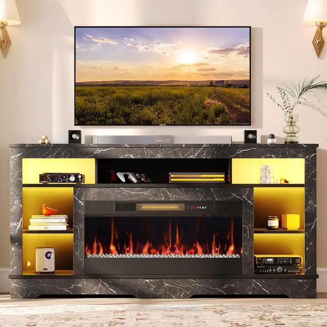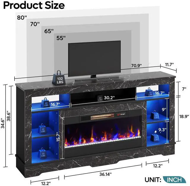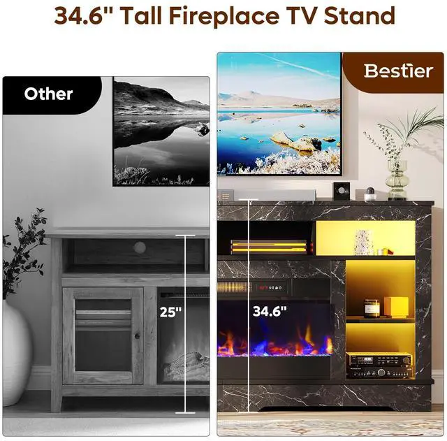 Upgrade your living room or bedroom with the Bestier 71" Fireplace TV Stand, a stylish TV entertainment center with fireplace that combines warmth and functionality. The safe 36" electric fireplace, certified by CSA/ELT, heats up to 400 sq. ft., ensuring a cozy atmosphere. This LED TV stand offers 7 vibrant colors and 20 dynamic modes to set the perfect mood. Designed for 75-80 inch TVs, this sturdy TV stand with fireplace supports up to 286 lbs. With a TV console table featuring multiple storage shelves, you can easily organize game consoles, books, and more. Easy to assemble, this fireplace entertainment center is the perfect addition to any home.