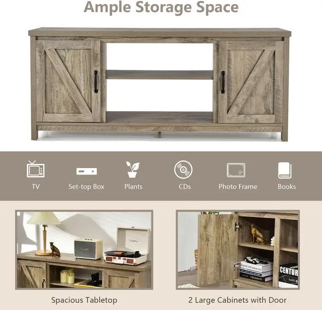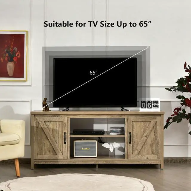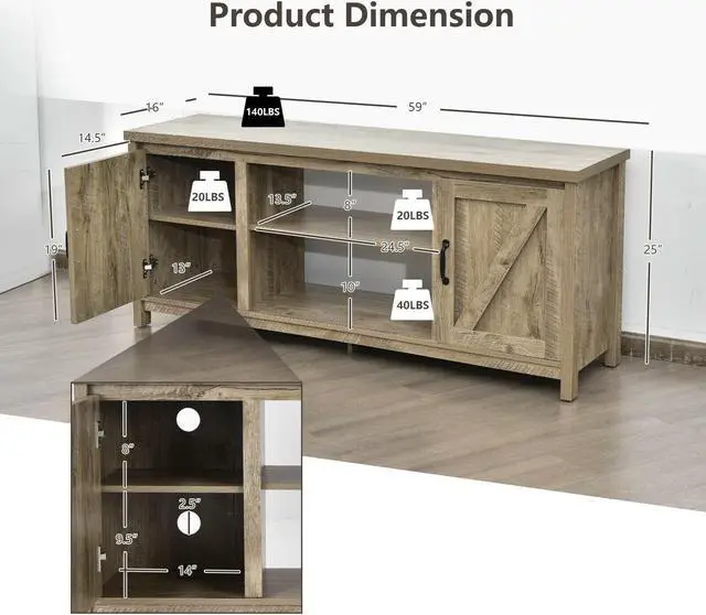 59" Wide TV Stand: Features a spacious tabletop, this TV stand can easily accommodate TVs up to 65", which also can be used for displaying other decorations. Besides, 4 cable holes on the backboard of the TV console can facilitate device connection and keep wires neatly arranged.