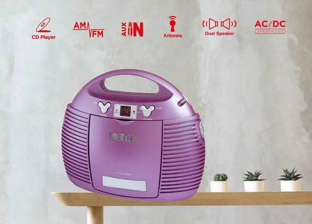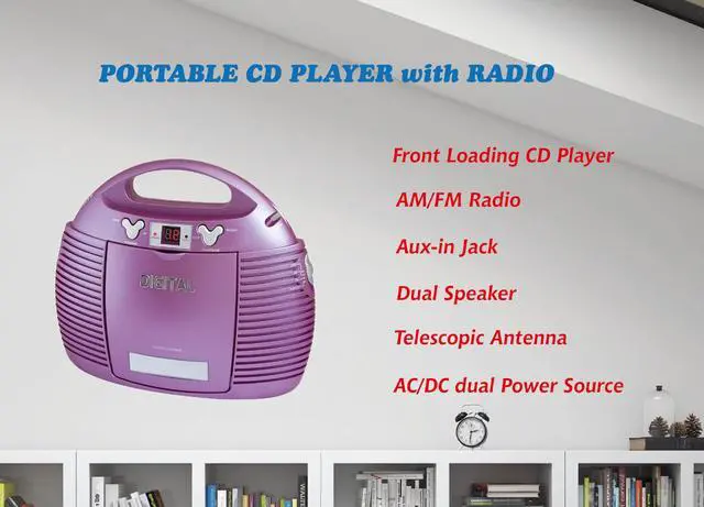 Vertical CD Player, AM/FM analog radio, Aux-in Jack for external audio devices, AC/DC dual power source.