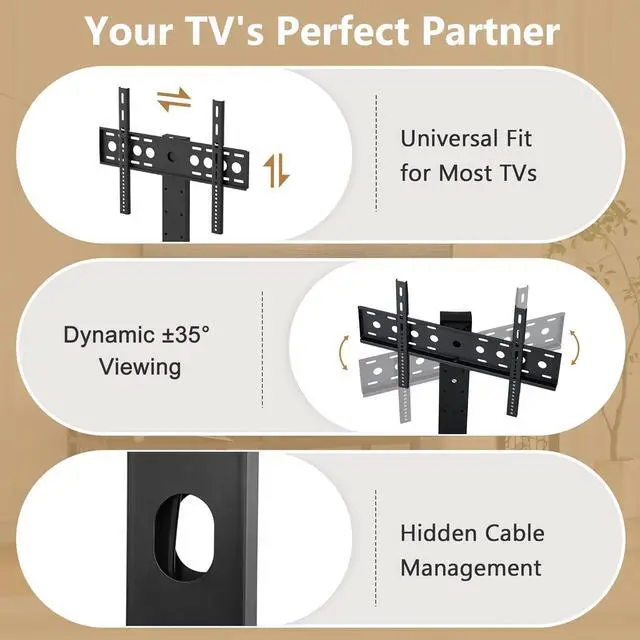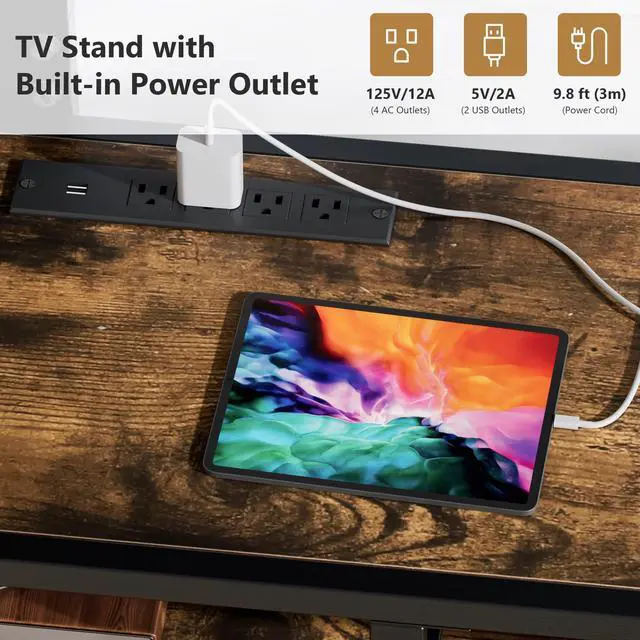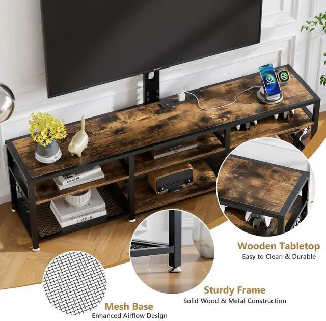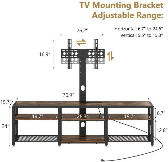 This multifunctional TV stand with an integrated adjustable mount serves as a practical and stylish centerpiece for any living room or bedroom. It eliminates the need for wall drilling while supporting most 40 to 80 inch TVs, with customizable height and width adjustments to achieve comfortable viewing angles from any seating position. Built with a combination of sturdy engineered wood and a durable metal frame, the unit provides reliable stability and high weight capacity for both the TV surface and storage shelves. The built-in power outlets and USB ports allow convenient charging for multiple devices, while thoughtful cable management design keeps wires organized and reduces clutter. Spacious open shelves offer ample room for media consoles, speakers, and decorative items, and their open structure promotes proper airflow to prevent electronics from overheating. With a charming rustic brown finish and modern rectangular shape, this entertainment console blends well with various interior styles, bringing both functionality and aesthetic appeal to daily home entertainment use.