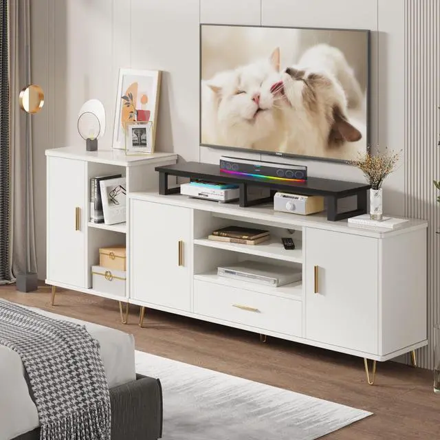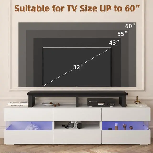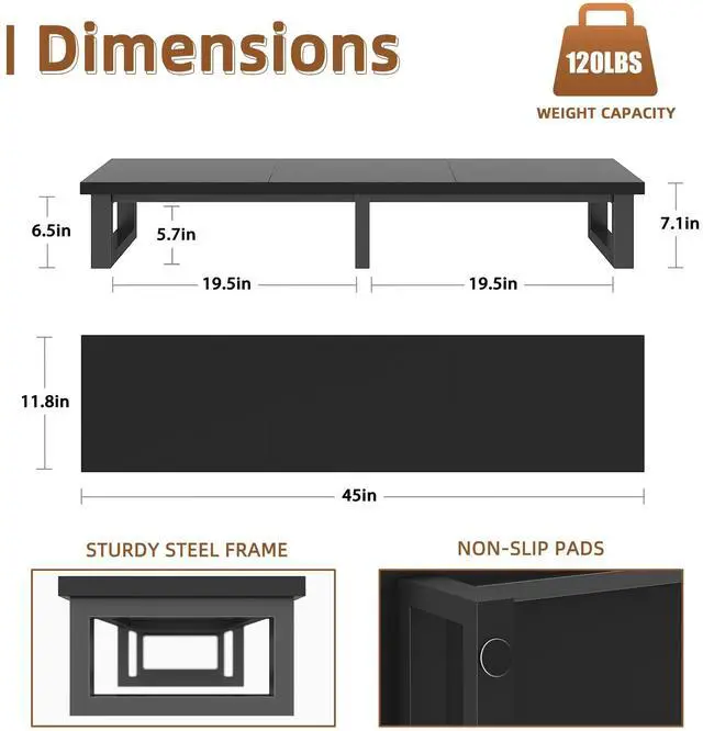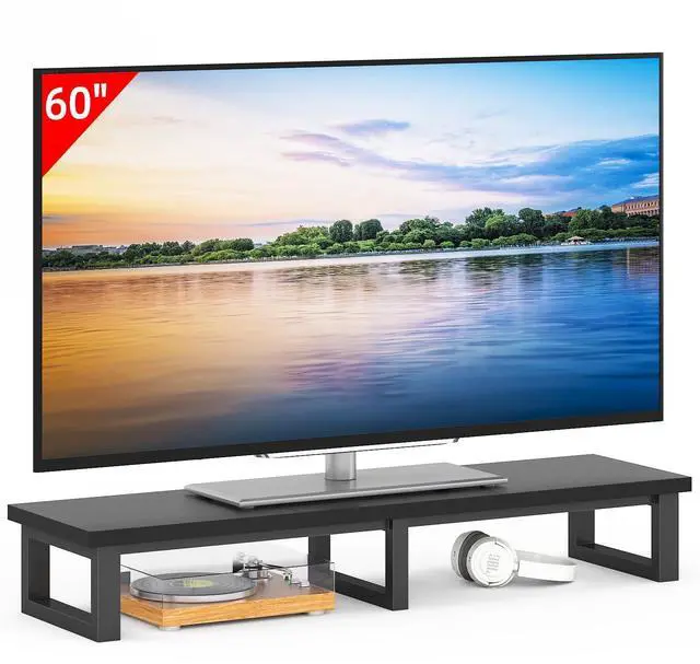 | This large tabletop riser combines heavy-duty support and practical storage to optimize living room and office spaces. With a 45-inch width, it safely holds flat and curved TVs up to 60 inches or dual 32-inch monitors, making it ideal for both entertainment and work setups. The reinforced steel frame and engineered wood top support up to 120 pounds, while non-slip leg pads prevent scratches and sliding. Its 7.1-inch height elevates screens to a more comfortable viewing level and opens up room underneath for soundbars, cable boxes, gaming consoles and accessories, eliminating clutter. The versatile design works equally well as a monitor stand, laptop riser or printer shelf, adapting to different needs. It features a modern black finish that blends with any decor and supports quick, straightforward assembly with all hardware included. Stable, functional and space-saving, this riser enhances organization and comfort in homes, offices and entertainment areas. |