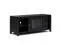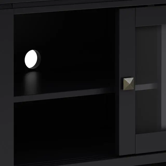 Features two (2) sliding tempered glass doors that open to a cabinet with two (2) adjustable shelves