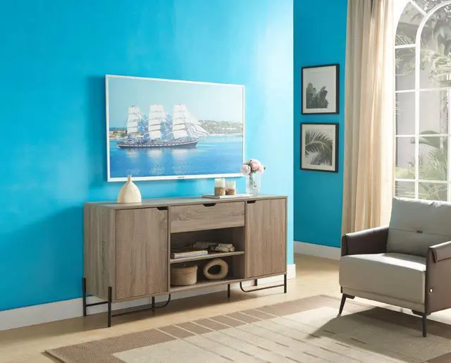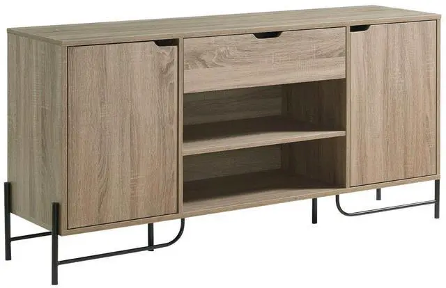 Two open shelves Two side cabinets, with two shelves in each cabinet One drawer on pre-assembled drawer glides Metal legs Shelf max wt 10lbs Drawer max wt 5lbs