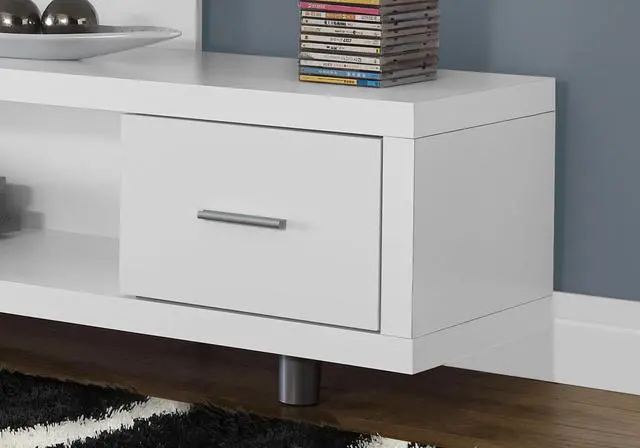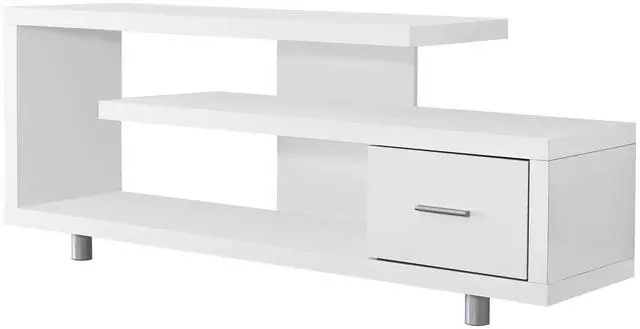 The full media stand features a durable composite finish in glossy white on all sides for a complete and rich look