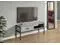 48-inch TV stand in a grey wood-look finish with a tall black metal frame accommodates most TVs when centered on the top panel