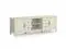 Features a large centrally located open area with four (4) side drawers as well as two open spaces; the two (2) large side storage cabinets open to one (1) adjustable shelf each