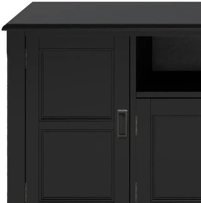 Features two (2) centrally located open areas with two drawers as well as two (2) framed doors with enclosed spaces; the two (2) large side storage cabinets open to one adjustable shelf each.
