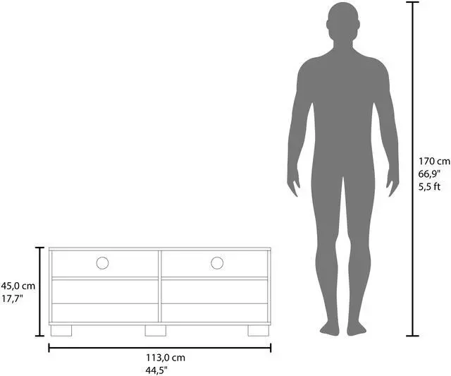 • Compact dimensions (17.7'' H x 44.5'' W x 15.8'' D) allow the unit to fit into small spaces while still supporting standard-sized TVs.