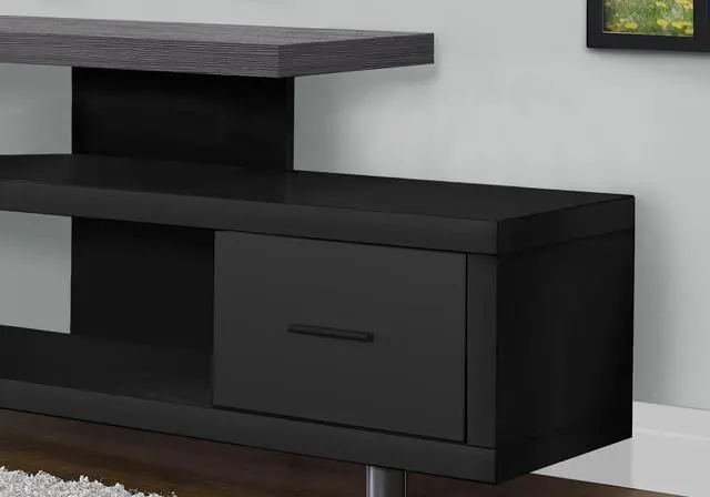 Unique Art-Deco inspired TV table in black and grey accommodates all TV sizes equipped with a center pedestal stand