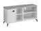 Thoughtful design details include hinges in the cabinet for smooth opening and closing, floor protectors for the metal legs to help prevent scratches, and an opening in the back of the upper-right storage area for easy cable management