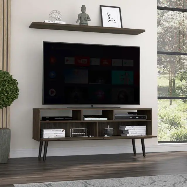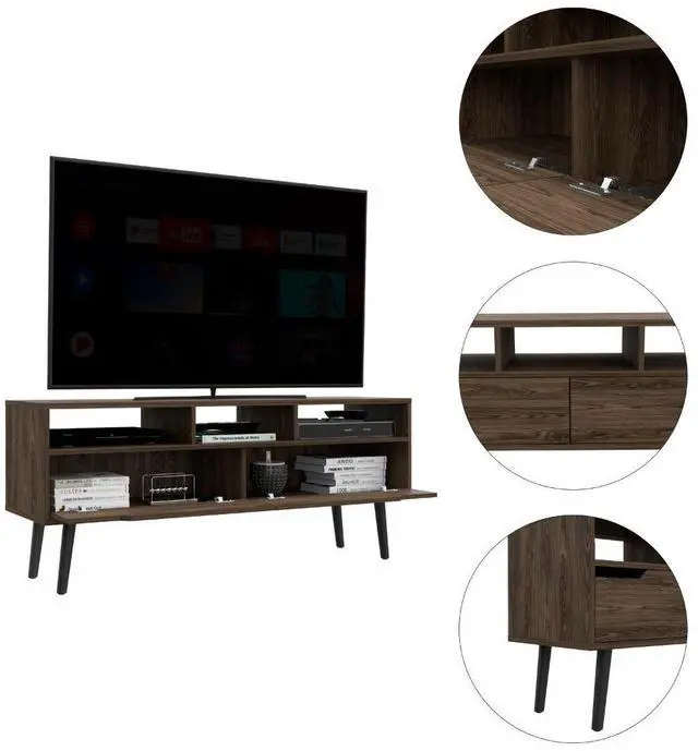 Large top surface measures 56" Supports TVs up to 51" Includes 3 open shelves for storing gadgets and accessories Includes 2 internal shelves that measure 66.1" W x 18.9" H.
