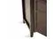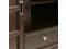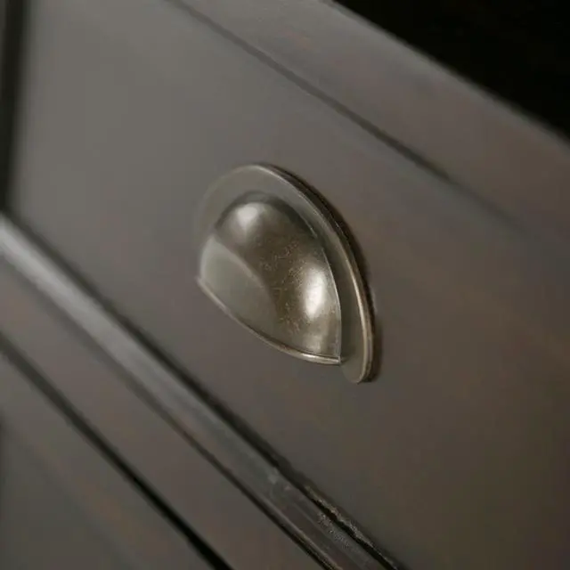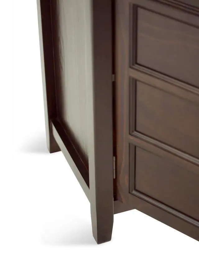 Transitional design includes rounded molded table top, ladder framed doors, square, slightly tapered legs and antique bronze classic drawer pulls