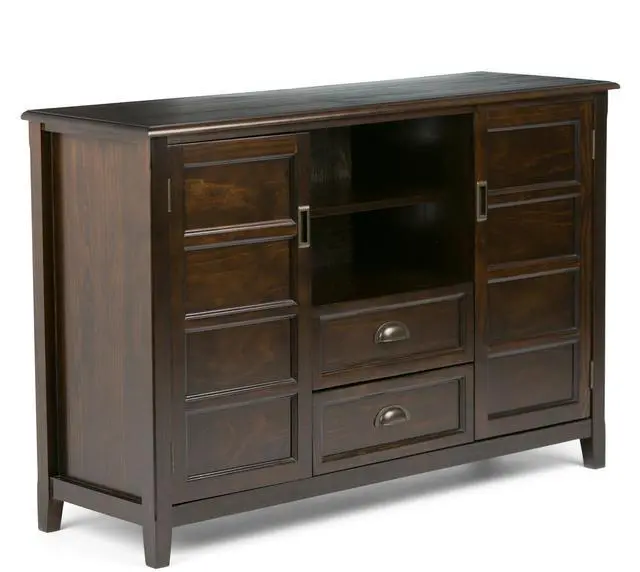 Features two (2) central drawers with metal glides, open center area with adjustable shelf and two (2) side doors that open to large storage spaces with two (2) shelves each