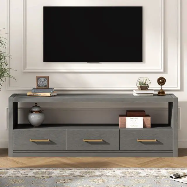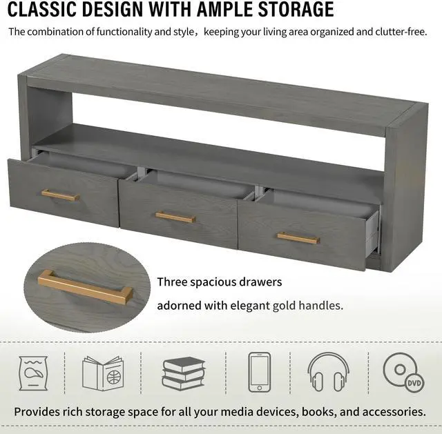 Generous Storage Space: Our TV stand offers abundant storage options with three spacious drawers, providing plenty of room for your media essentials, books, and more. The top surface and drawer fronts are perfect for displaying decor items, ensuring that your living space stays organized and stylish.
