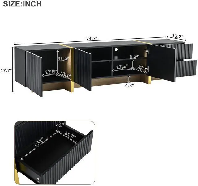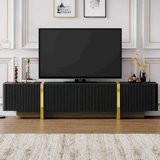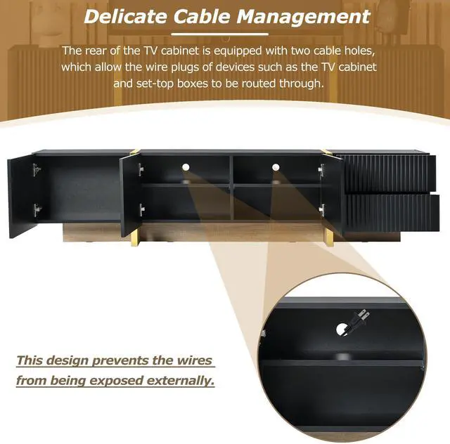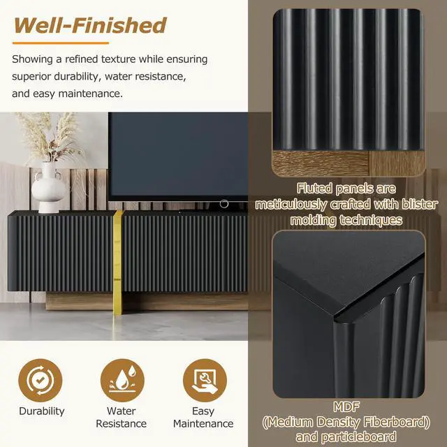 Featuring smooth fluted panels and golden wood grain legs, this TV stand emanates a luxurious elegance that harmoniously complements a wide range of modern furniture styles.