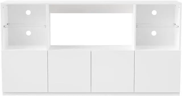 This stylish TV Stand showcases a reflective high-gloss surface, exuding a blend of luxury and modernity. The transparent tempered glass shelves in open storage compartments is a fantastic way to display your collections, enhanced by the shimmering LED light. Measuring 67.7W x 13.7D x 35.4H, it accommodates TVs up to 75 inches, becoming the focal point of your living room.