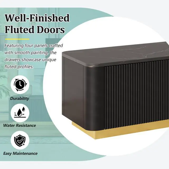 Modern Luxury Aesthetics: The cabinet's top features a beautiful faux marble-patterned veneer, creating a clean and stylish look. With its overall curved silhouette and golden base, the TV stand exudes a modern luxury ambiance, seamlessly blending elegance with contemporary design.