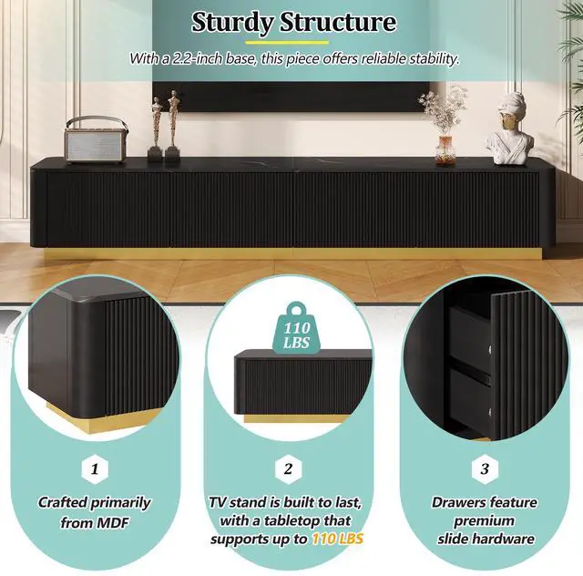 Sturdy Structure: With a 2.2 -inch base, this piece offers reliable stability. Crafted primarily from MDF, this TV stand is built to last, with a tabletop that supports up to 220 LBS. Additionally, the drawers feature premium slide hardware, maintaining seamless operation even with frequent use.