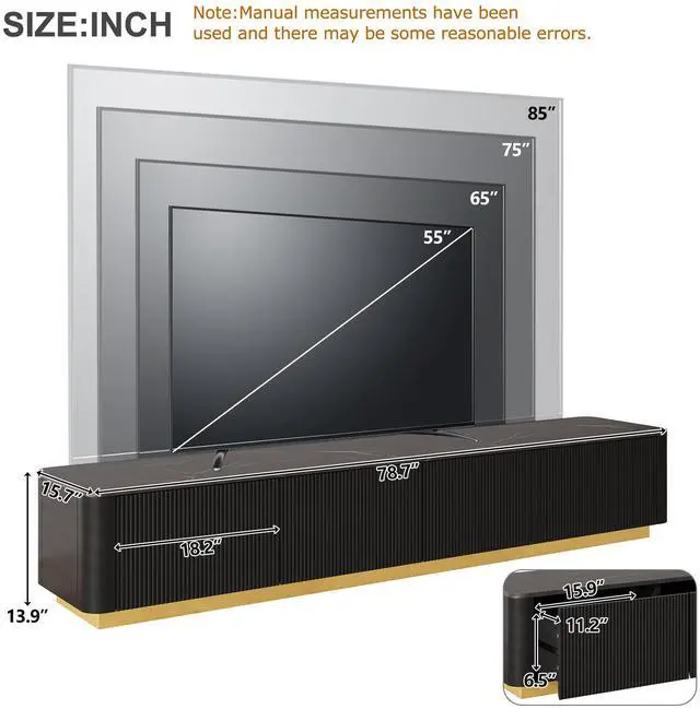 Generous Storage Capacity: The 78.7W tabletop offers ample space for your TV up to 85inch, while four drawers provide dedicated storage for your various items. The drawers feature angled pull handles beneath the door panels, ensuring easy opening and closingblending practicality with sleek design.