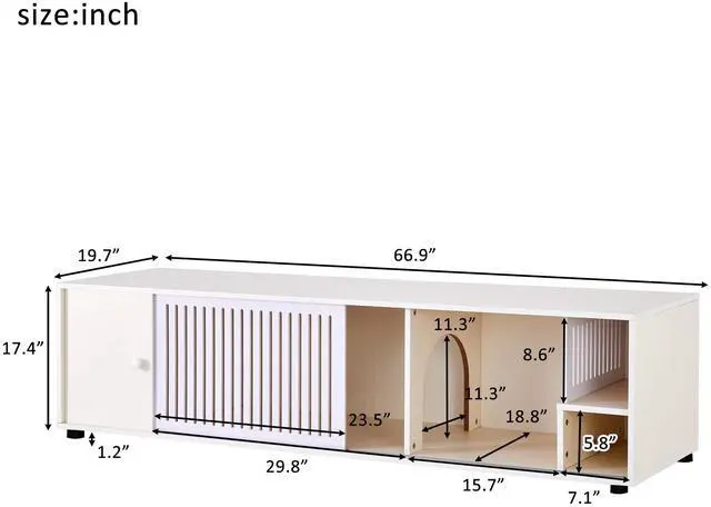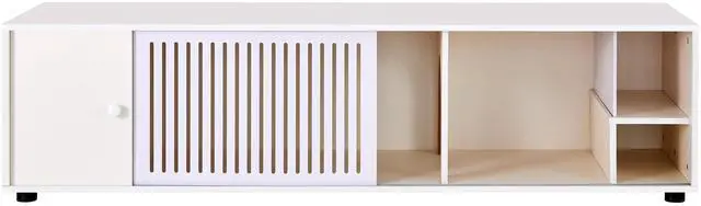 Design Features: The TV stand features a modern and minimalist design with a clean white finish that can easily match different interior styles. The slatted door design adds a touch of elegance while also allowing for proper ventilation of any electronic devices stored inside. Additionally, the open compartments are strategically placed, providing easy access for both you and your cats.