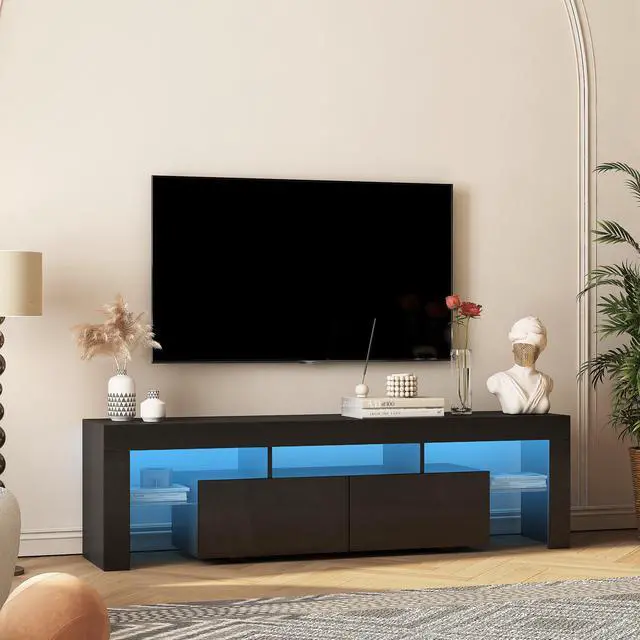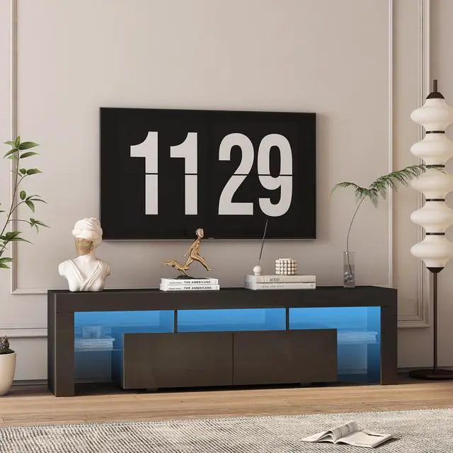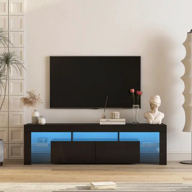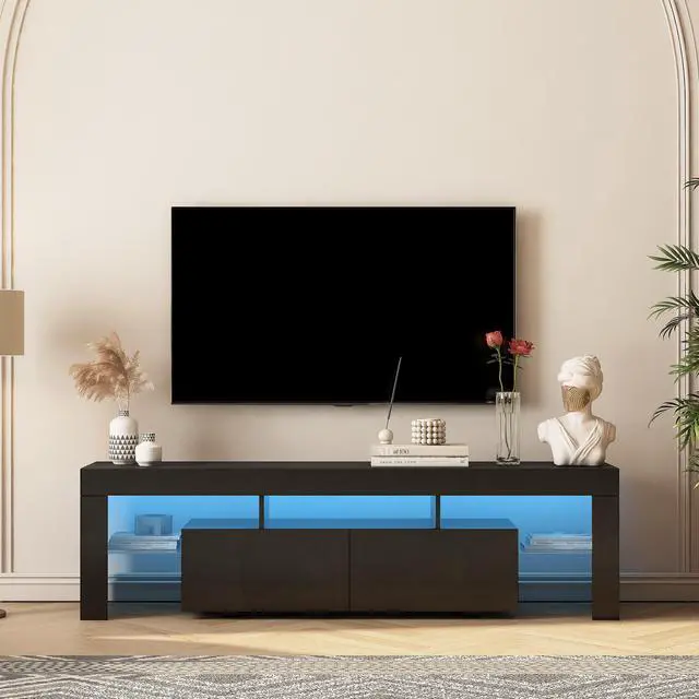 Black Entertainment center with Storage: This high gloss LED entertainment center is big enough to store your TV related items, open and hidden storage spaces ensure convenience while effectively preventing dust from entering, and has a cushioned hinge to reduce noise when closed