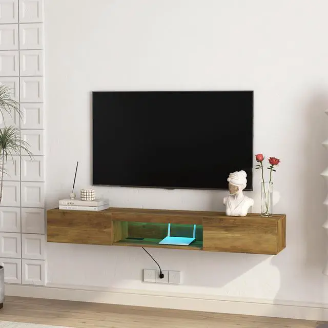 The floating TV stand uses thicker materials and is equipped with standard wooden nail wall-mounting hardware for stronger load-bearing capacity.