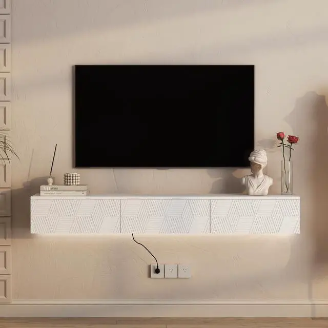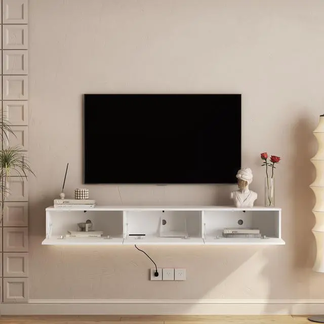 The floating TV stand uses thicker materials and is equipped with standard wooden nail wall-mounting hardware for stronger load-bearing capacity.