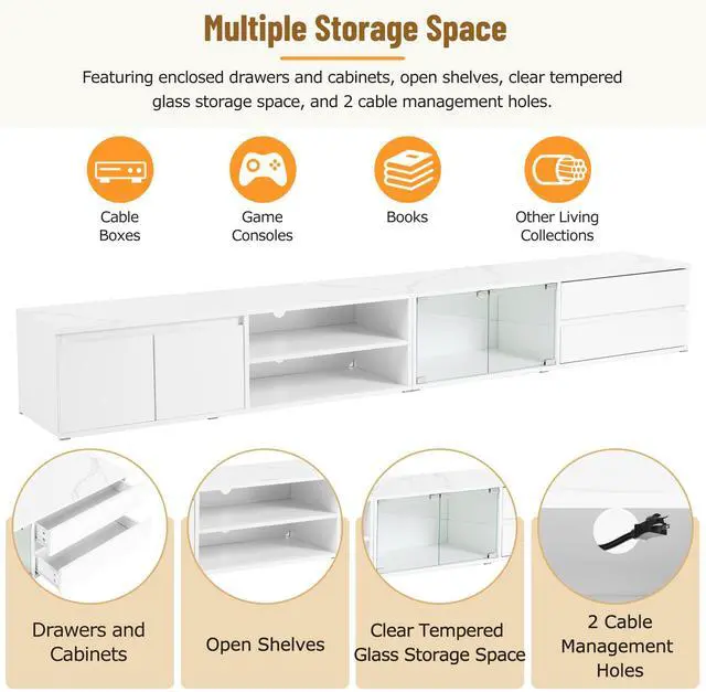 Featuring enclosed drawers and cabinets, open shelves, clear tempered glass storage space, and 2 cable management holes, this TV cabinet providing ample and convenient space for your cable boxes, game consoles, books, or other living collections.