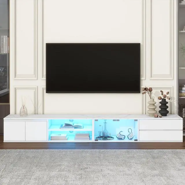 With its simple rectangular appearance, this TV stand adds a touch of modern orderly comfort to your living space. Meanwhile the spacious imitation marble tabletop also provides elegant and high-end visual experience, Which will complement various home styles.