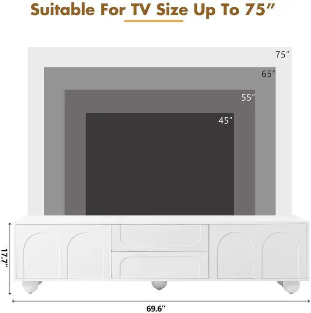Sleek Appearance: This 69.6W TV cabinet with classic cream color design boasts unique arched panels that reveals a delicate shape in a simple and generous outlook. The bottom is equipped with 5 ball-shaped legs, not only maintaining the stability of the cabinet but also enhancing the overall atmosphere of your living space.