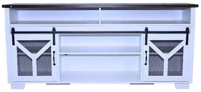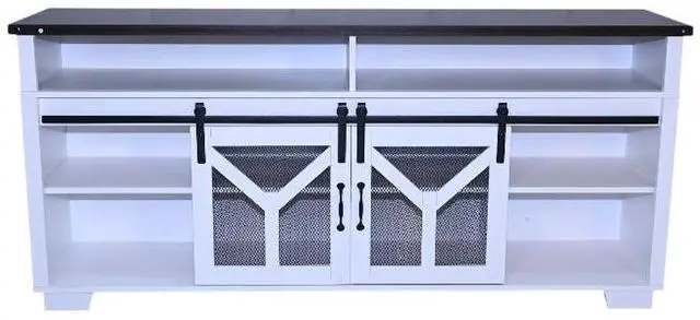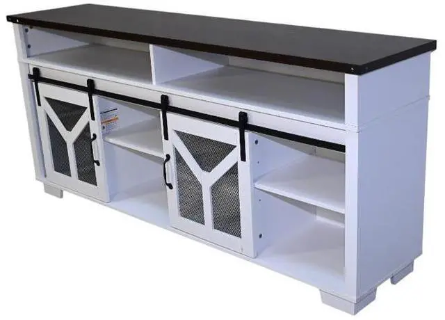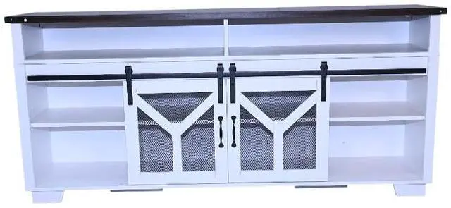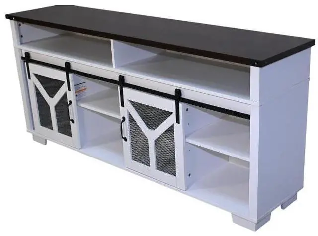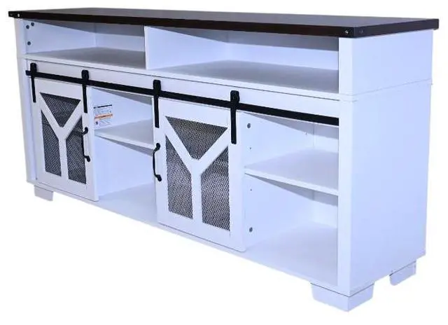 Stylish and Functional DesignThis TV stand features a unique combination of a white body and a black walnut - colored top, creating an elegant and modern look that seamlessly blends with various home decor styles. Sliding barn doors with inset metal mesh and dark iron-tone hardware not only add a touch of rustic charm but also provide convenient storage access, allowing you to keep your media devices and accessories organized.